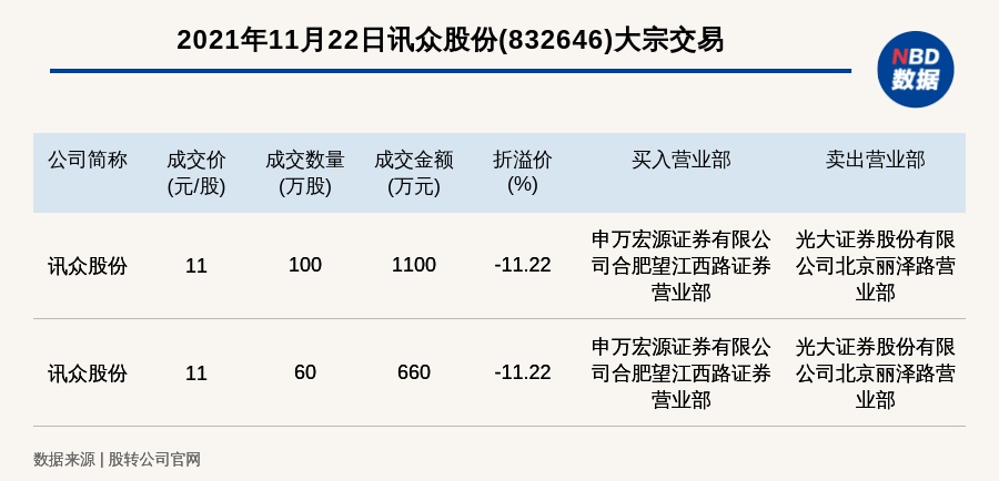 每经讯,2021年11月22日,新三板创新层公司讯众股份(832646)发生2笔大宗交易,总成交金额为1760万元,成交金额最高的一笔成交价11元/股,成交数量100万股,成交金额1100万元,折价11.22%。买入营业部是申万宏源证券有限公司合肥望江西路证券营业部,卖出营业部是光大证券股份有限公司北京丽泽路营业部。