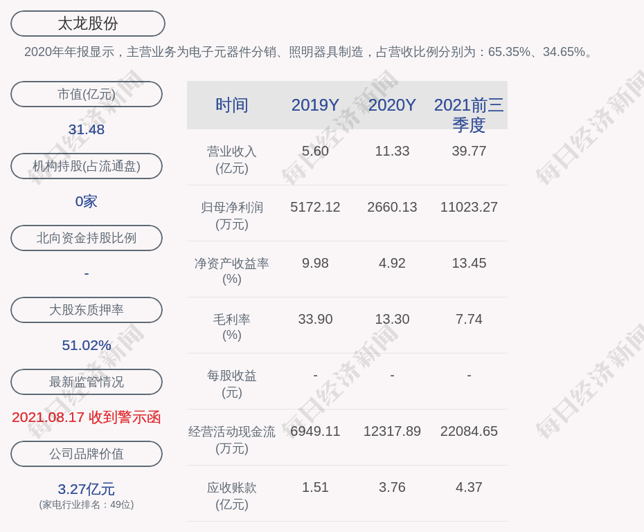 2020年年报显示,太龙股份的主营业务为电子元器件分销、照明器具制造,占营收比例分别为:65.35%、34.65%。