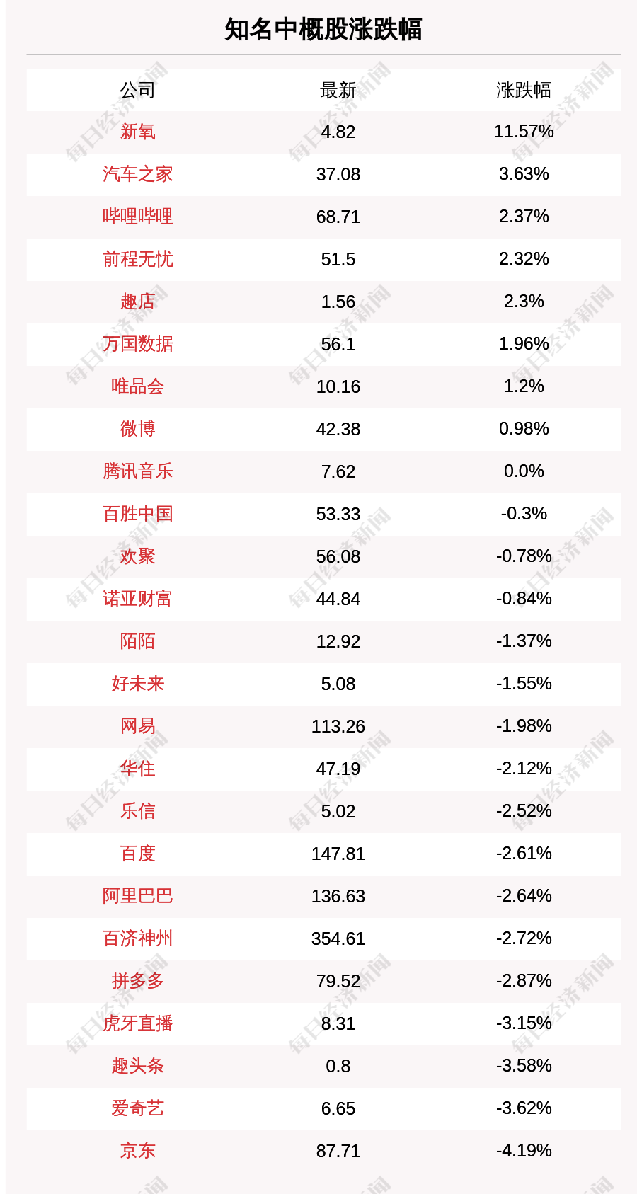 每经AI快讯:北京时间11月23日05:00,知名中概股中新氧、汽车之家、哔哩哔哩、前程无忧、趣店涨幅居前,收盘分别上涨11.57%、3.63%、2.37%、2.32%、2.3%。京东、爱奇艺、趣头条、虎牙直播、拼多多跌幅居前,收盘分别下跌4.19%、3.62%、3.58%、3.15%、2.87%。