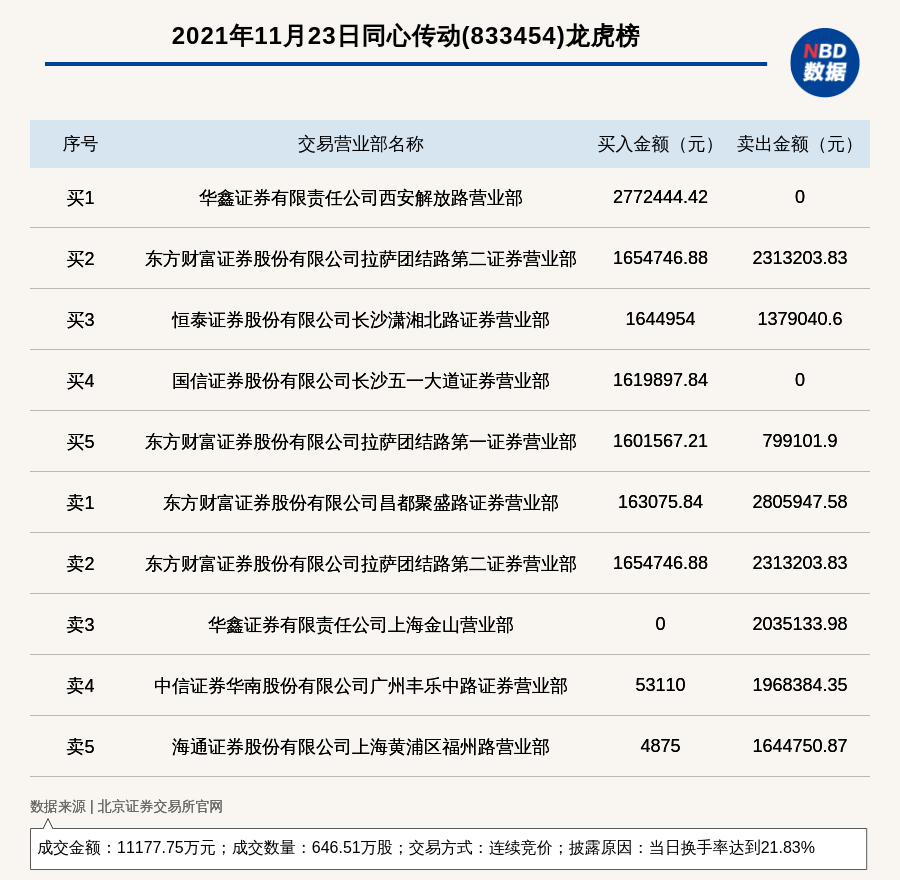 每经讯,2021年11月23日,北交所上市公司同心传动(833454)登上龙虎榜,交易方式是连续竞价,披露原因是当日换手率达到21.83%,成交数量646.51万股,成交金额11177.75万元。买一席位为华鑫证券有限责任公司西安解放路营业部,买入277.24万元;卖一席位为东方财富证券股份有限公司昌都聚盛路证券营业部,卖出280.59万元。
