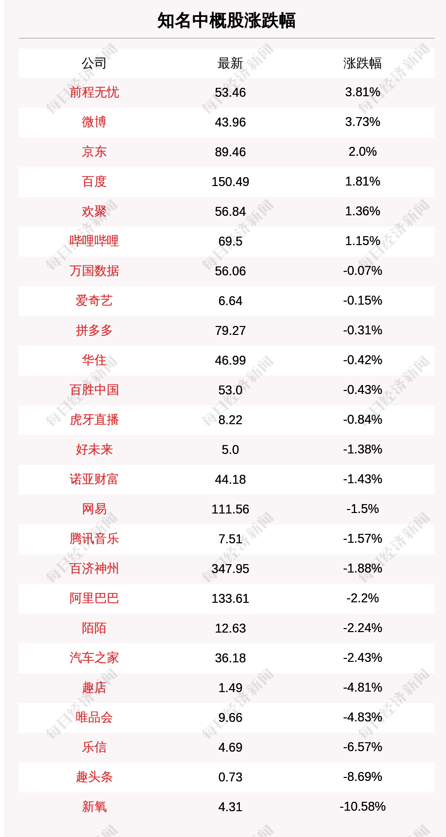 每经AI快讯:北京时间11月24日05:00,知名中概股中前程无忧、微博、京东、百度、欢聚涨幅居前,收盘分别上涨3.81%、3.73%、2.0%、1.81%、1.36%。新氧、趣头条、乐信、唯品会、趣店跌幅居前,收盘分别下跌10.58%、8.69%、6.57%、4.83%、4.81%。