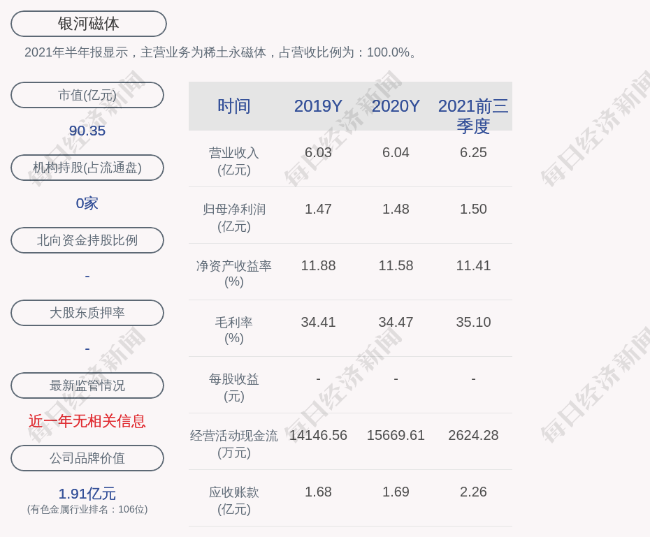 2021年半年报显示,银河磁体的主营业务为稀土永磁体,占营收比例为:100.0%。
