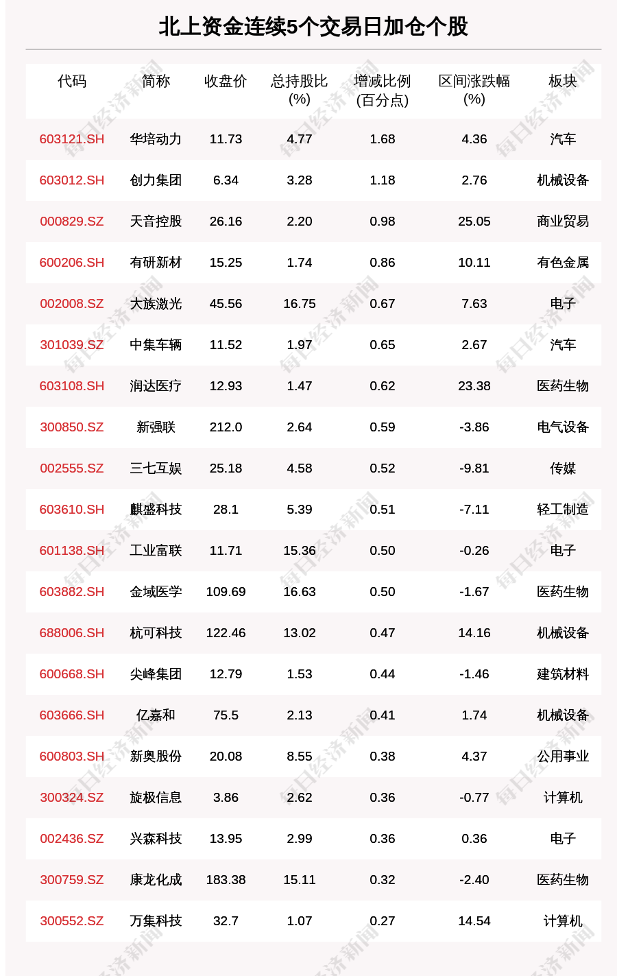 每经AI快讯,11月24日,北上资金连续5个交易日买入55个股。北上资金连续5个交易日加仓个股中,华培动力(603121.SH,收盘价:11.73元)增持比例增幅最大,5个交易日增持1.68个百分点,其他增持比例较大的个股包括创力集团(603012.SH,收盘价:6.34元)、天音控股(000829.SZ,收盘价:26.16元)、有研新材(600206.SH,收盘价:15.25元),分别增持1.18个百分点、0.98个百分点、0.86个百分点。