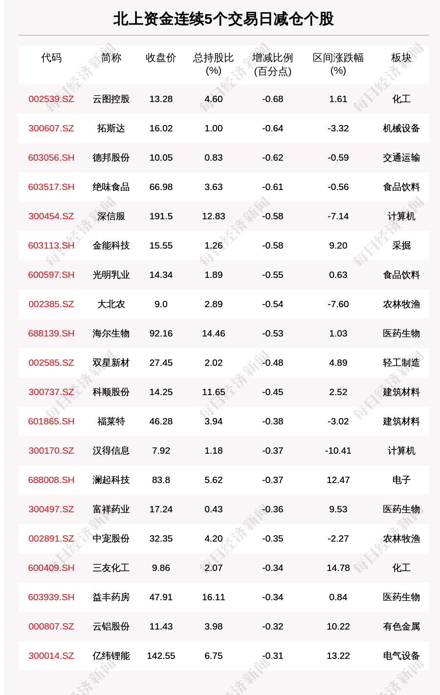 每经AI快讯,11月24日,北上资金连续5个交易日卖出53个股。北上资金连续5个交易日减仓个股中,云图控股(002539.SZ,收盘价:13.28元)减持比例增幅最大,5个交易日减持0.68百分点,其他跌幅较大的个股包括拓斯达(300607.SZ,收盘价:16.02元)、德邦股份(603056.SH,收盘价:10.05元)、绝味食品(603517.SH,收盘价:66.98元),分别减持0.64个百分点、0.62个百分点、0.61个百分点。