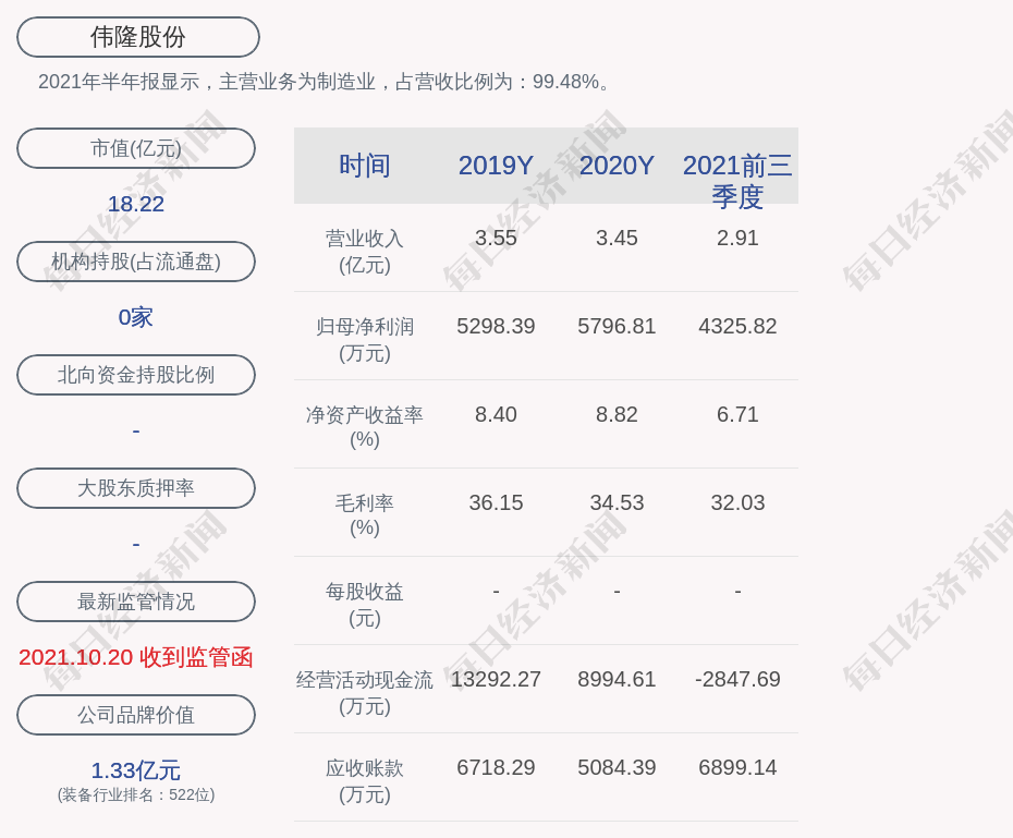 2021年半年报显示,伟隆股份的主营业务为制造业,占营收比例为:99.48%。