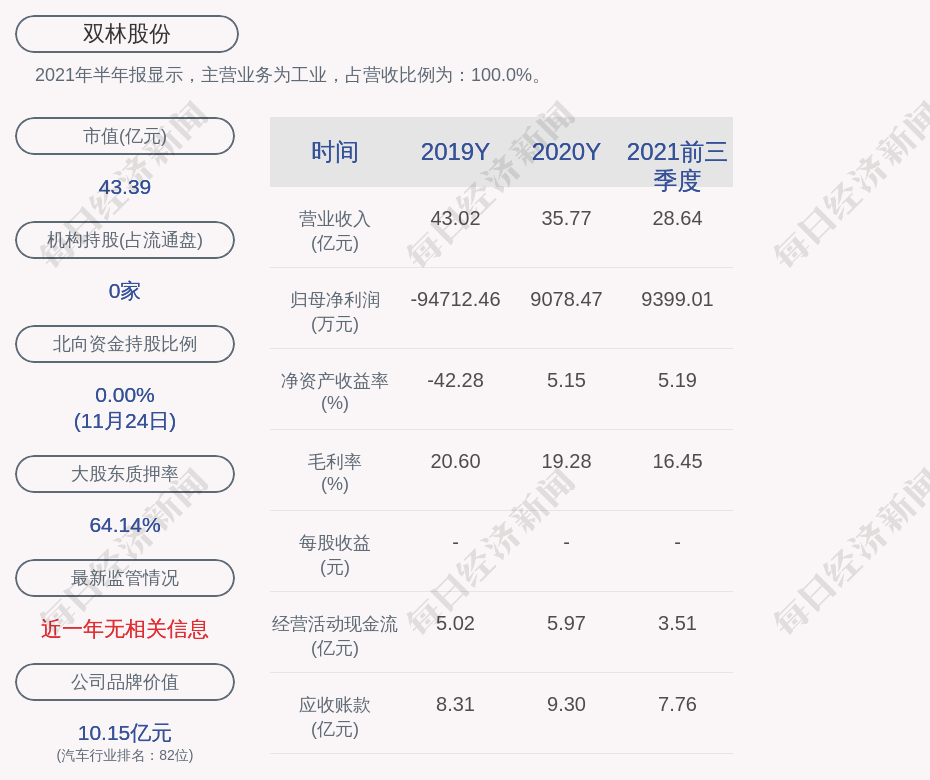 2021年半年报显示,双林股份的主营业务为工业,占营收比例为:100.0%。