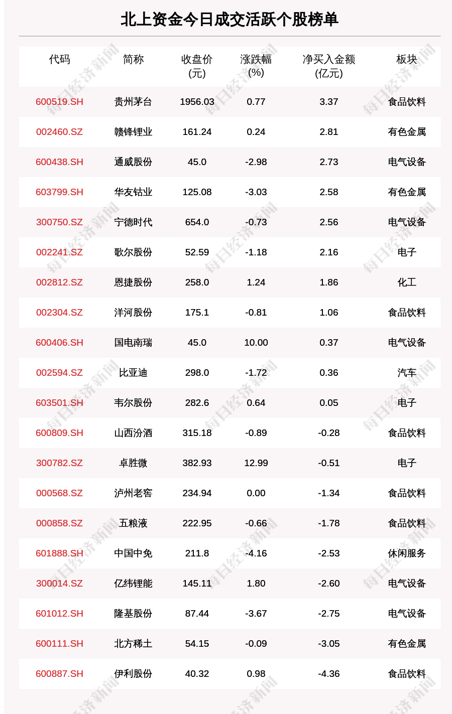 11月25日,北上资金成交活跃个股榜单中,净买入个股共11只,金额最多的是贵州茅台(600519.SH,收盘价:1956.03元),净买入3.370亿元;净卖出个股共9只,金额最多的是伊利股份(600887.SH,收盘价:40.32元),净卖出4.358亿元。