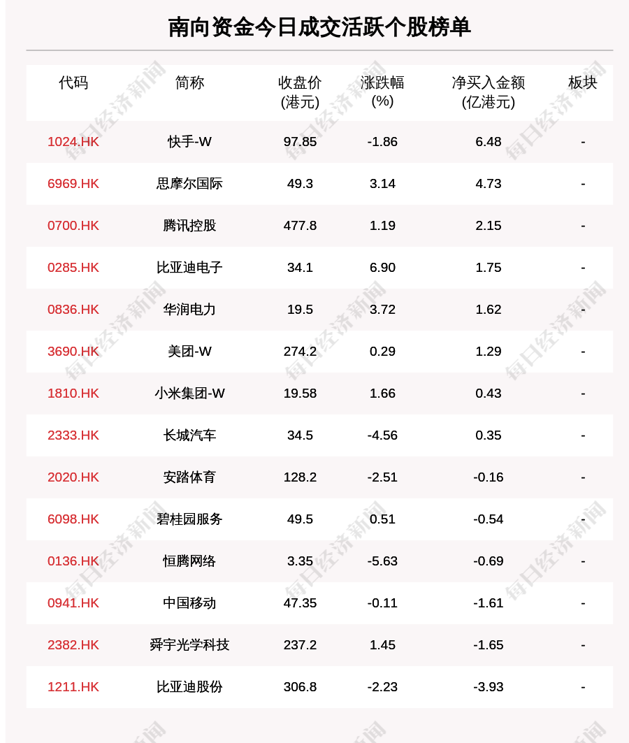 南向资金成交活跃个股榜单中,净买入个股共8只,金额最多的是快手-W(1024.HK,收盘价:97.85港元),净买入6.484亿港元;净卖出个股共6只,金额最多的是比亚迪股份(1211.HK,收盘价:306.8港元),净卖出3.932亿港元。