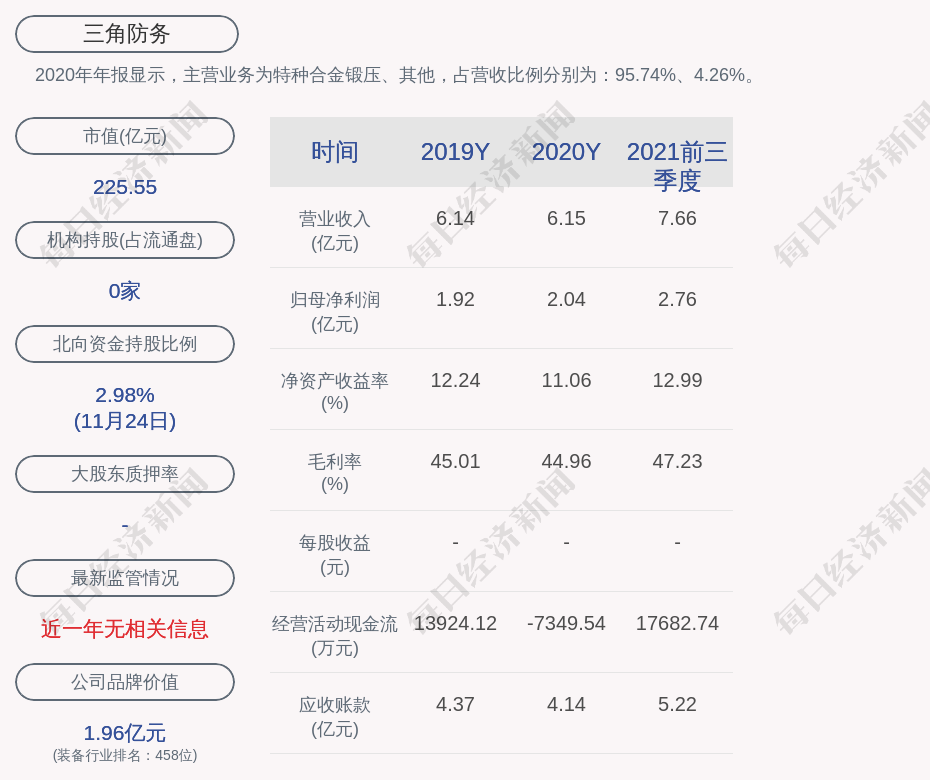 2020年年报显示,三角防务的主营业务为特种合金锻压、其他,占营收比例分别为:95.74%、4.26%。