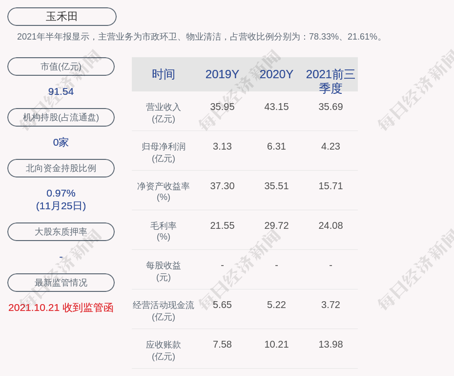 2021年半年报显示,玉禾田的主营业务为市政环卫、物业清洁,占营收比例分别为:78.33%、21.61%。