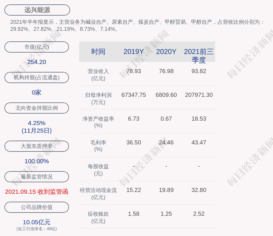 2021年半年报显示,远兴能源的主营业务为碱业自产、尿素自产、煤炭自产、甲醇贸易、甲醇自产,占营收比例分别为:29.92%、27.82%、21.19%、8.73%、7.14%。