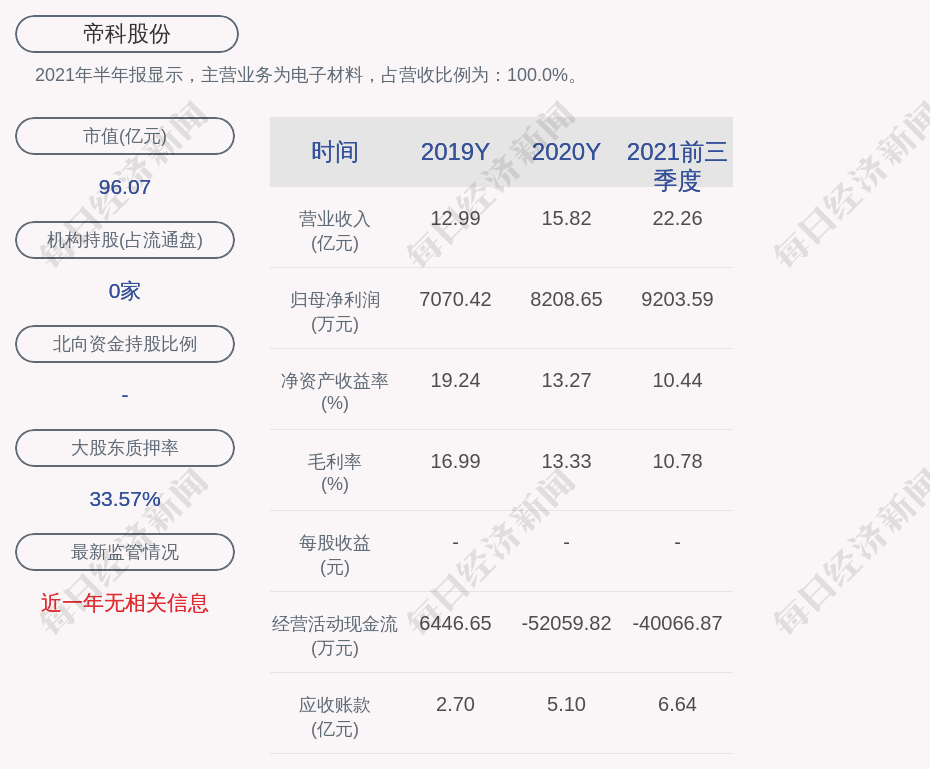 2021年半年报显示,帝科股份的主营业务为电子材料,占营收比例为:100.0%。