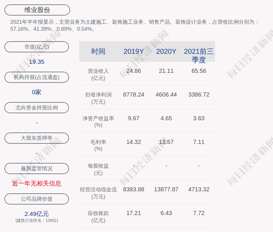 2021年半年报显示,维业股份的主营业务为土建施工、装饰施工业务、销售产品、装饰设计业务,占营收比例分别为:57.16%、41.39%、0.89%、0.54%。