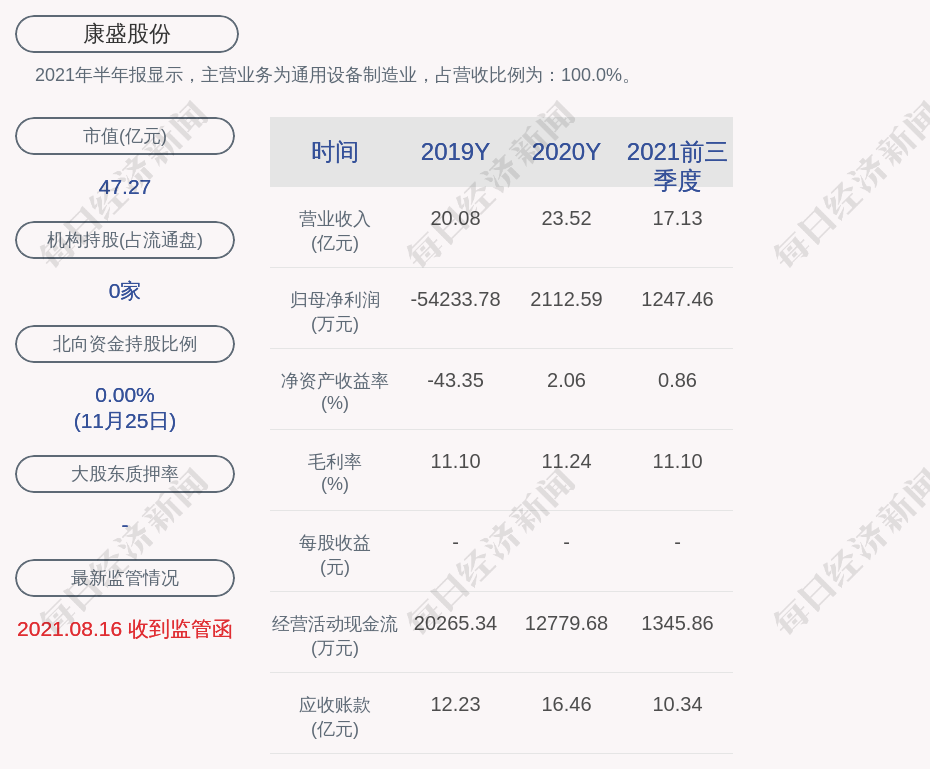 2021年半年报显示,康盛股份的主营业务为通用设备制造业,占营收比例为:100.0%。