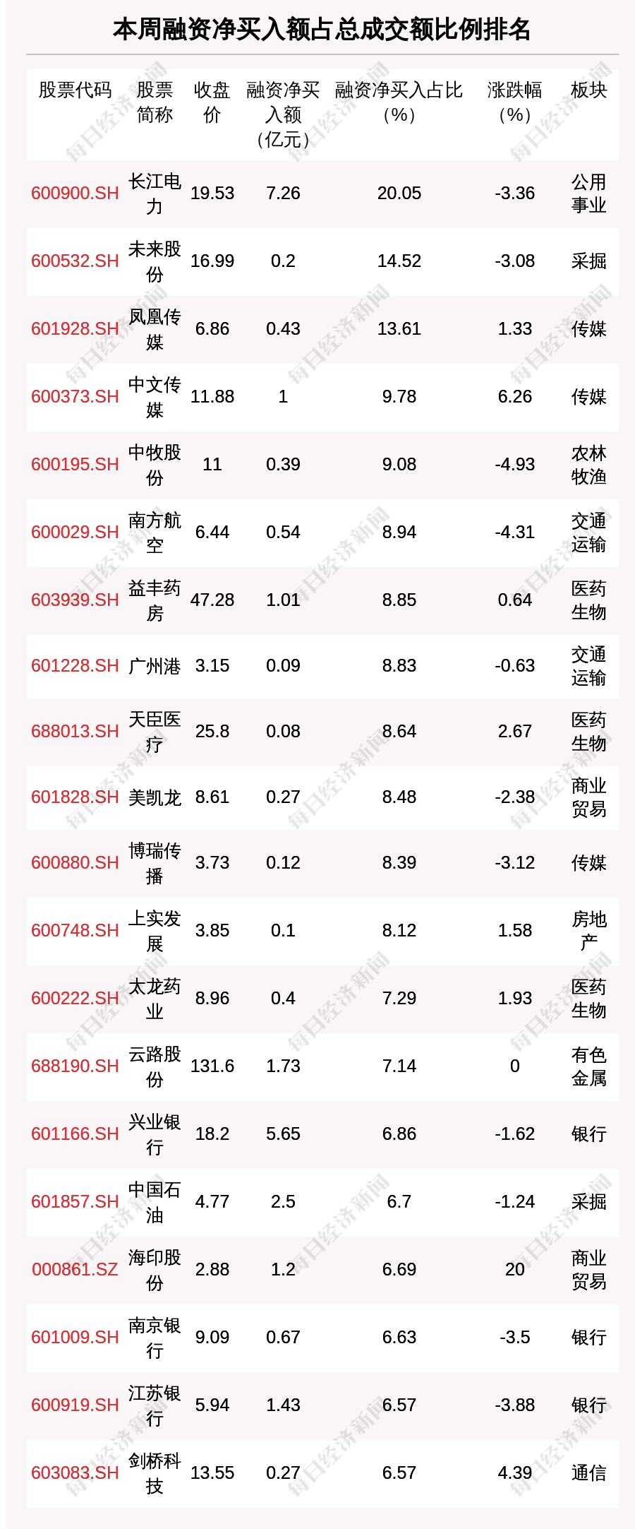 两市共有3只股票融资净买入额占总成交金额比例超10%,其中长江电力、未来股份、凤凰传媒排名前三,占比分别为20.05%、14.52%、13.61%。