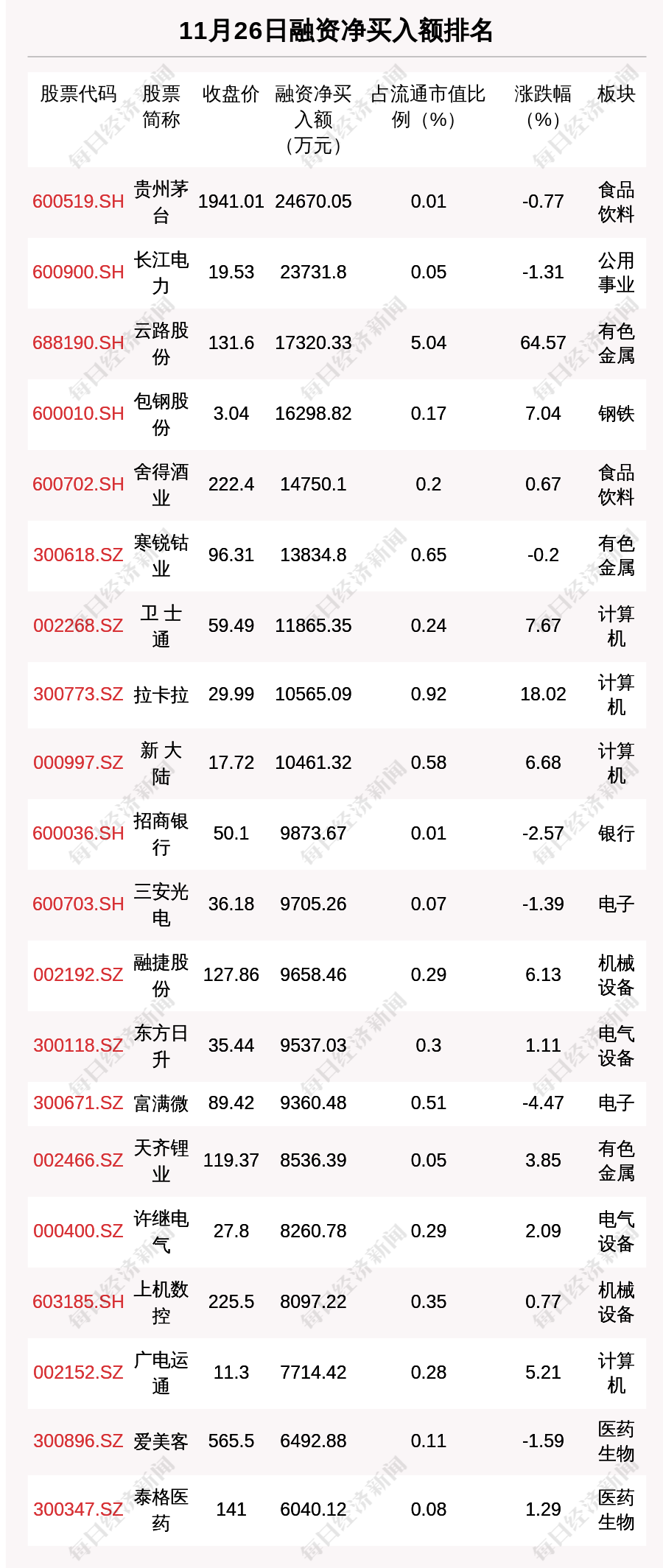从融资资金净买入金额来看,共有9只个股净买入金额超亿元,其中贵州茅台、长江电力、云路股份排名前三,买入金额分别为2.47亿元、2.37亿元、1.73亿元。