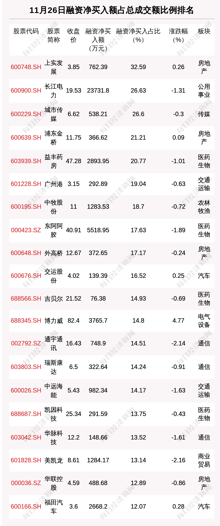 11月26日两市共有913只个股有融资资金净买入。共有34只股票融资净买入额占总成交金额比例超10%,其中上实发展、长江电力、城市传媒排名前三,占比分别为32.59%、26.63%、26.6%。