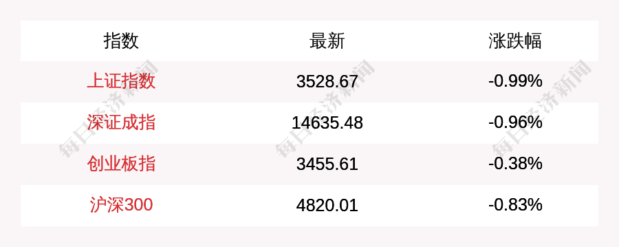 每经AI快讯:北京时间11月29日9:30,上证指数开盘跌35.42点,跌幅为0.99%,报3528.67点;深证成指开盘下跌141.69点,跌幅为0.96%,报14635.48点;创业板指开盘下跌13.26点,跌幅为0.38%,报3455.61点;沪深300开盘下跌40.12点,跌幅为0.83%,报4820.01点。