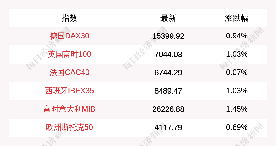 每经AI快讯:北京时间11月29日16:00,德国DAX30指数开盘上涨142.88点,涨幅为0.94%,报15399.92点;英国富时100指数开盘上涨72.47点,涨幅为1.03%,报7116.5点;法国CAC40指数开盘上涨4.56点,涨幅为0.07%,报6744.29点;西班牙IBEX35指数开盘上涨86.77点,涨幅为1.03%,报8489.47点;富时意大利MIB指数开盘上涨373.89点,涨幅为1.45%,报26226.88点;欧洲斯托克50指数开盘上涨28.21点,涨幅为0.69%,报4117.79点。