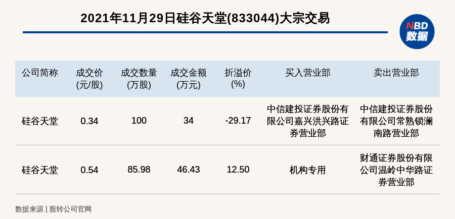 每经讯,2021年11月29日,新三板基础层公司硅谷天堂(833044)发生2笔大宗交易,溢价率最高的一笔成交价0.54元/股,成交数量85.98万股,成交金额46.43万元,溢价12.5%。买入营业部是机构专用,卖出营业部是财通证券股份有限公司温岭中华路证券营业部。