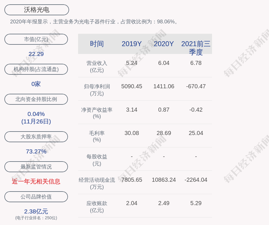 2020年年报显示,沃格光电的主营业务为光电子器件行业,占营收比例为:98.06%。