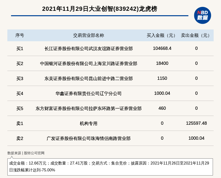 每经讯,2021年11月29日,新三板基础层公司大业创智(839242)登上龙虎榜,交易方式是集合竞价,披露原因是2021年11月26日至2021年11月29日涨跌幅累计达到-75.00%,成交数量27.41万股,成交金额12.66万元。买一席位为长江证券股份有限公司武汉友谊路证券营业部,买入10.47万元;卖一席位为机构专用,卖出12.56万元。