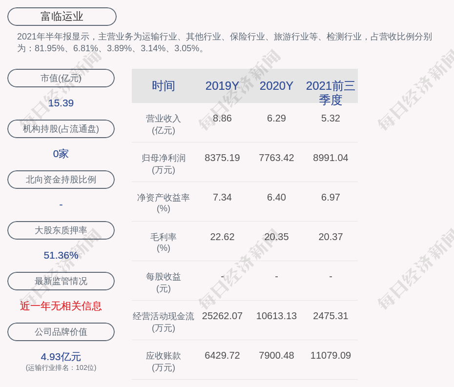 2021年半年报显示,富临运业的主营业务为运输行业、其他行业、保险行业、旅游行业等、检测行业,占营收比例分别为:81.95%、6.81%、3.89%、3.14%、3.05%。