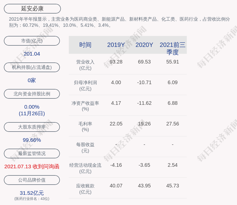 2021年半年报显示,延安必康的主营业务为医药商业类、新能源产品、新材料类产品、化工类、医药行业,占营收比例分别为:60.72%、19.41%、10.0%、5.41%、3.4%。