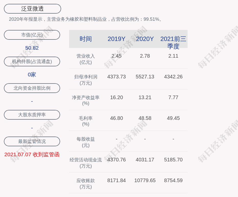 2020年年报显示,泛亚微透的主营业务为橡胶和塑料制品业,占营收比例为:99.51%。