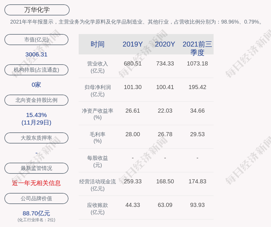 2021年半年报显示,万华化学的主营业务为化学原料及化学品制造业、其他行业,占营收比例分别为:98.96%、0.79%。