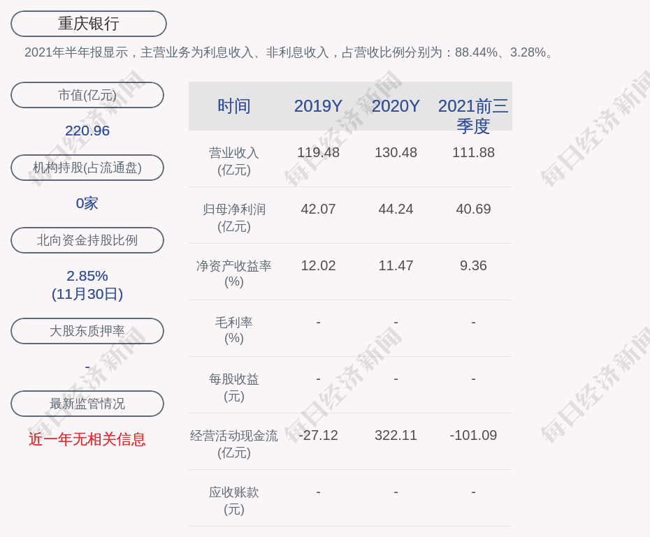 2021年半年报显示,重庆银行的主营业务为利息收入、非利息收入,占营收比例分别为:88.44%、3.28%。