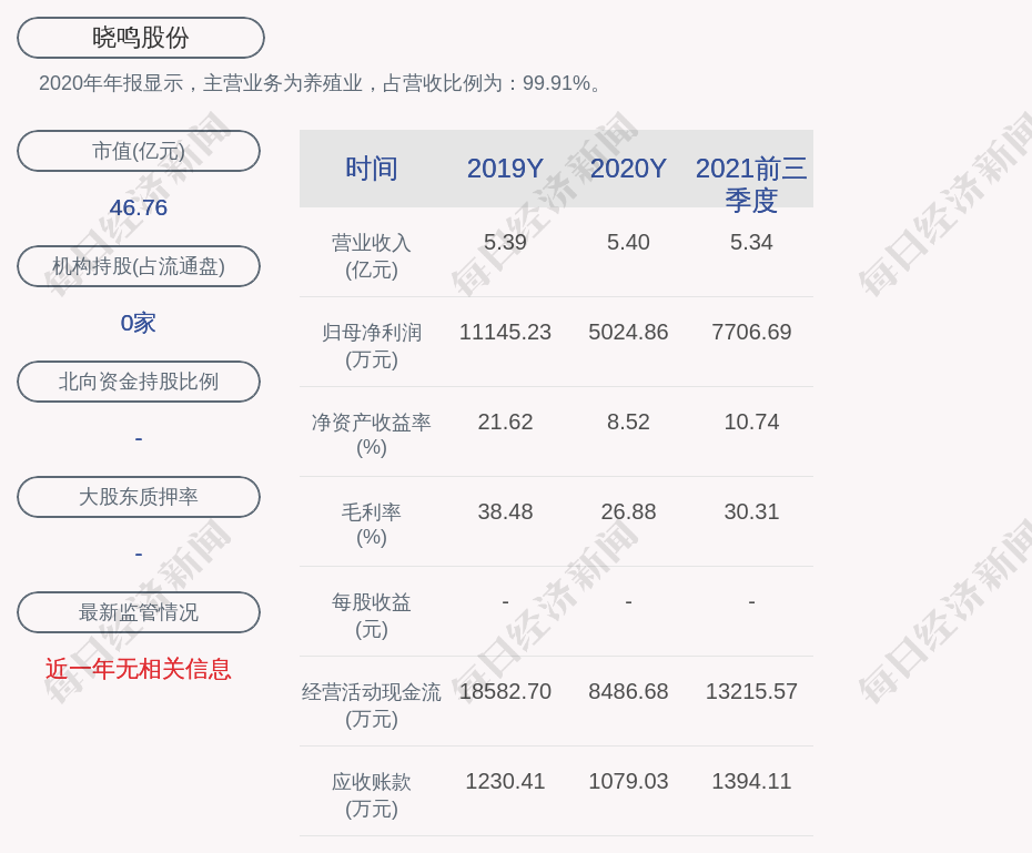 2020年年报显示,晓鸣股份的主营业务为养殖业,占营收比例为:99.91%。