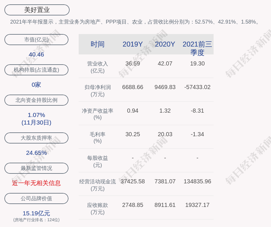 2021年半年报显示,美好置业的主营业务为房地产、PPP项目、农业,占营收比例分别为:52.57%、42.91%、1.58%。