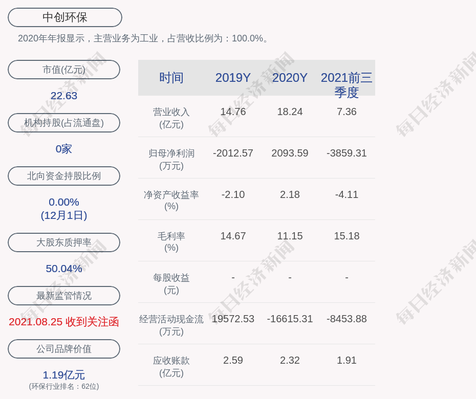 2020年年报显示,中创环保的主营业务为工业,占营收比例为:100.0%。