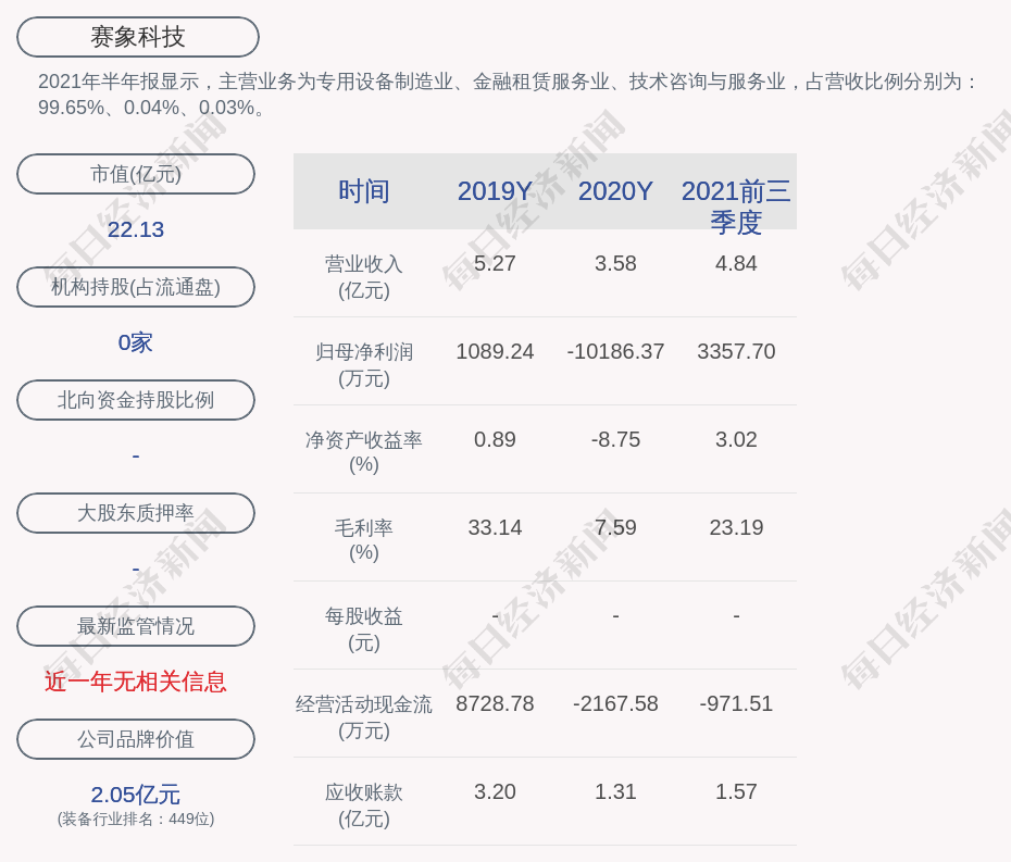 2021年半年报显示,赛象科技的主营业务为专用设备制造业、金融租赁服务业、技术咨询与服务业,占营收比例分别为:99.65%、0.04%、0.03%。
