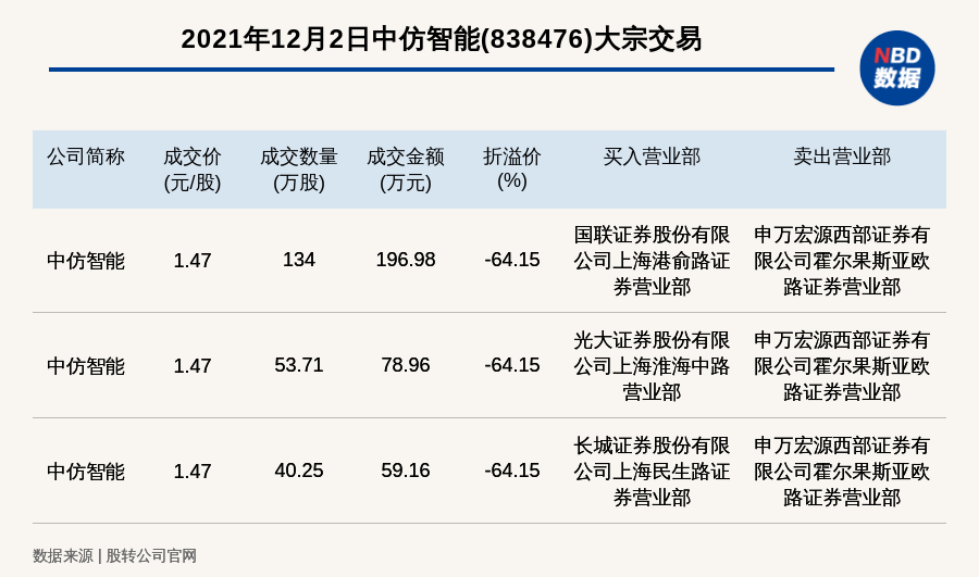每经讯,2021年12月2日,新三板基础层公司中仿智能(838476)发生3笔大宗交易,其中一笔成交价1.47元/股,成交数量134万股,成交金额196.98万元,折价64.15%。买入营业部是国联证券股份有限公司上海港俞路证券营业部,卖出营业部是申万宏源西部证券有限公司霍尔果斯亚欧路证券营业部。