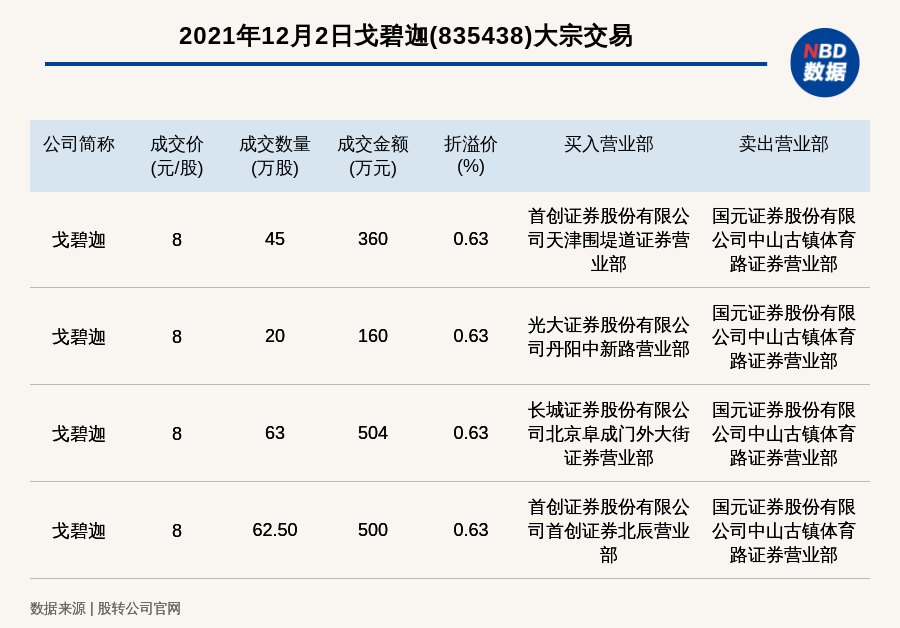 每经讯,2021年12月2日,新三板基础层公司戈碧迦(835438)发生4笔大宗交易,总成交金额为1524万元,成交金额最高的一笔成交价8元/股,成交数量63万股,成交金额504万元,溢价0.63%。买入营业部是长城证券股份有限公司北京阜成门外大街证券营业部,卖出营业部是国元证券股份有限公司中山古镇体育路证券营业部。