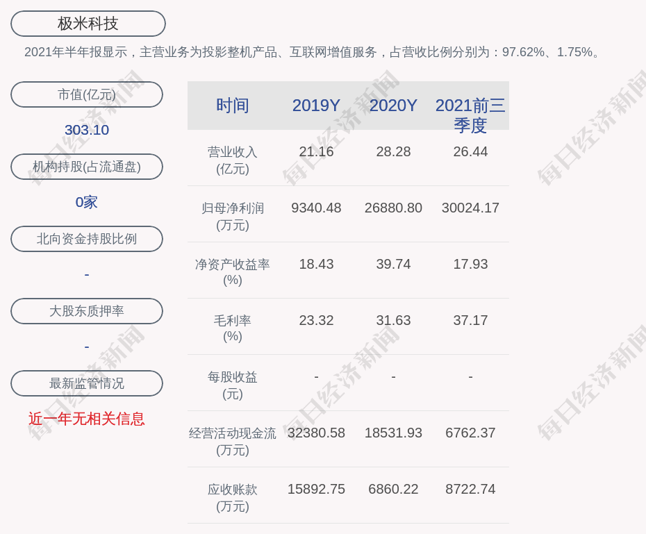 2021年半年报显示,极米科技的主营业务为投影整机产品、互联网增值服务,占营收比例分别为:97.62%、1.75%。