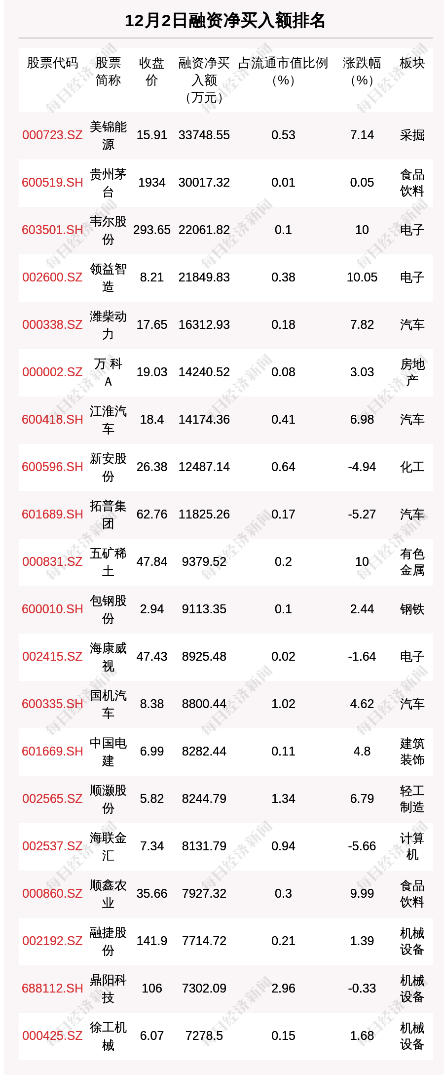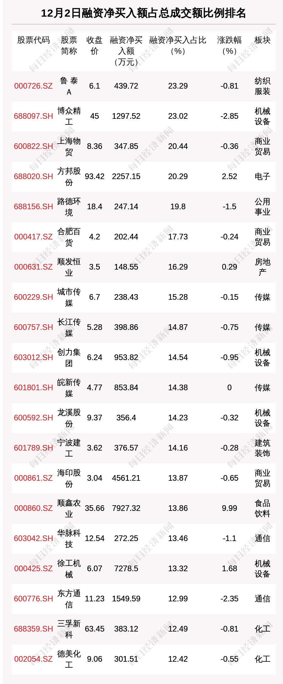12月2日两市共有1089只个股有融资资金净买入。共有45只股票融资净买入额占总成交金额比例超10%,其中鲁 泰A、博众精工、上海物贸排名前三,占比分别为23.29%、23.02%、20.44%。