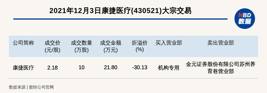 每经讯,2021年12月3日,新三板基础层公司康捷医疗(430521)发生一笔大宗交易,成交价2.18元/股,成交数量10万股,成交金额21.80万元,折价30.13%。买入营业部是机构专用,卖出营业部是金元证券股份有限公司苏州养育巷营业部。