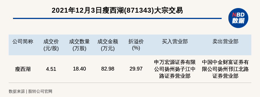 每经讯,2021年12月3日,新三板基础层公司瘦西湖(871343)发生一笔大宗交易,成交价4.51元/股,成交数量18.40万股,成交金额82.98万元,溢价29.97%。买入营业部是申万宏源证券有限公司扬州扬子江中路证券营业部,卖出营业部是中国中金财富证券有限公司扬州邗江北路证券营业部。