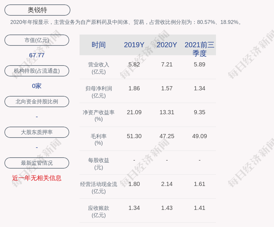 2020年年报显示,奥锐特的主营业务为自产原料药及中间体、贸易,占营收比例分别为:80.57%、18.92%。