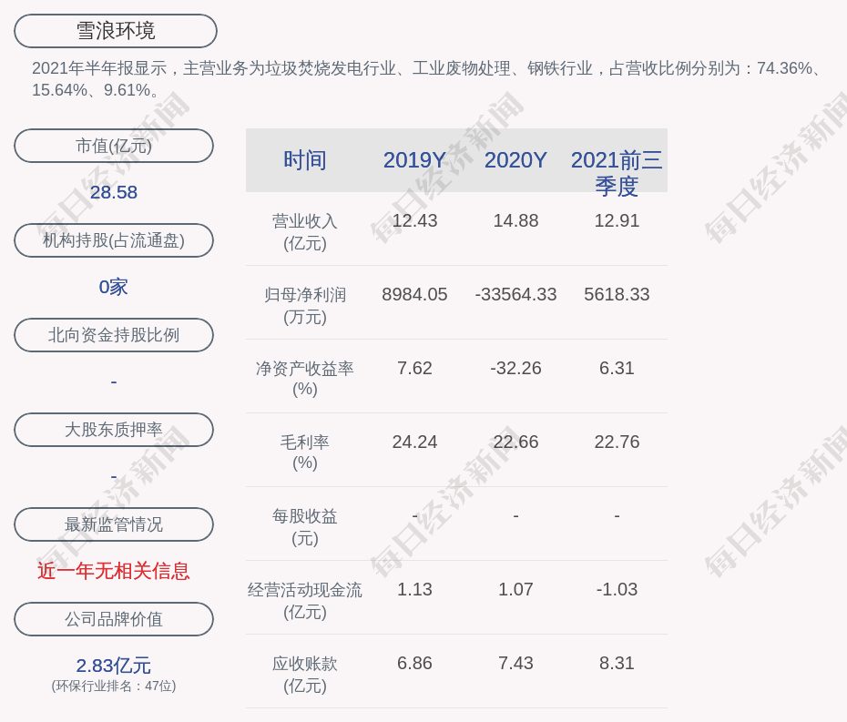 2021年半年报显示,雪浪环境的主营业务为垃圾焚烧发电行业、工业废物处理、钢铁行业,占营收比例分别为:74.36%、15.64%、9.61%。
