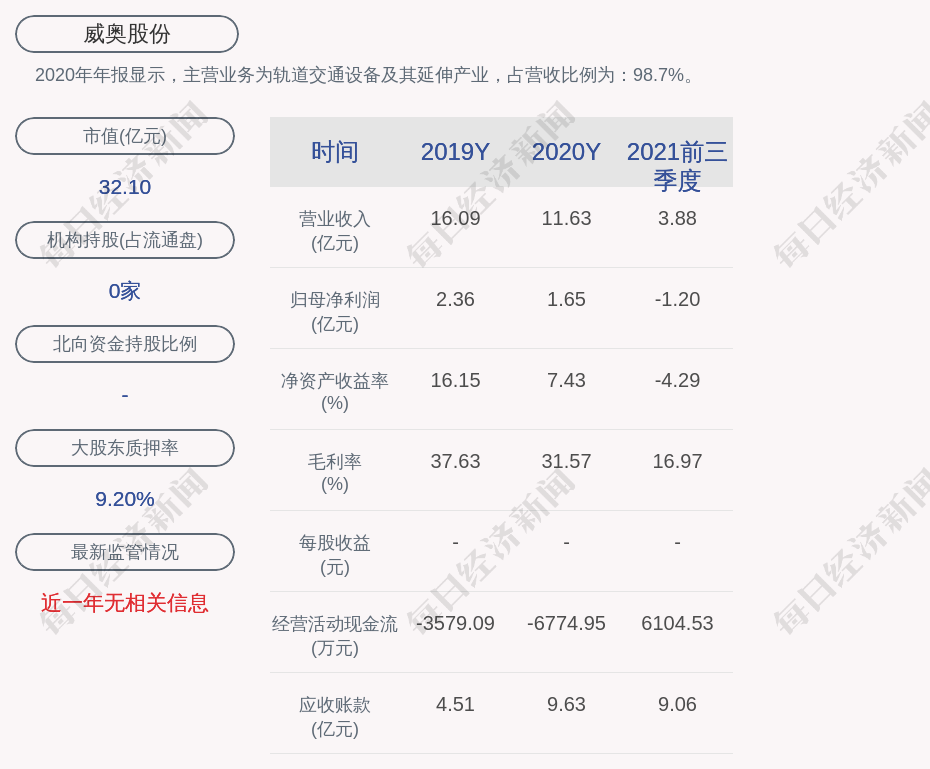 2020年年报显示,威奥股份的主营业务为轨道交通设备及其延伸产业,占营收比例为:98.7%。