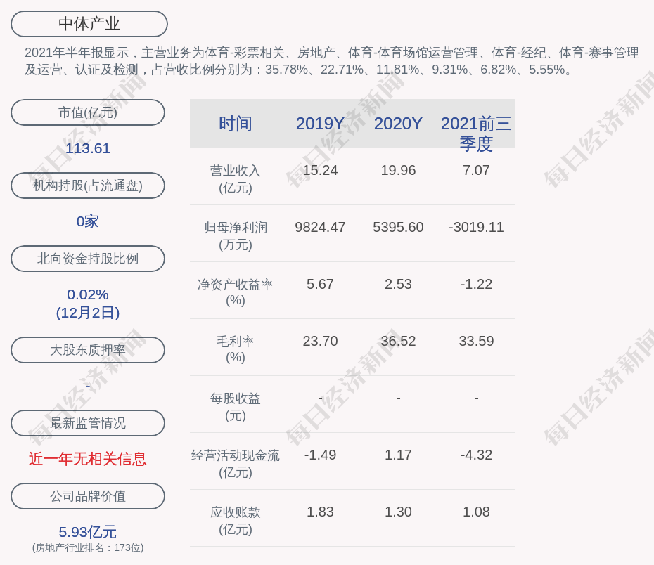 2021年半年报显示,中体产业的主营业务为体育-彩票相关、房地产、体育-体育场馆运营管理、体育-经纪、体育-赛事管理及运营、认证及检测,占营收比例分别为:35.78%、22.71%、11.81%、9.31%、6.82%、5.55%。