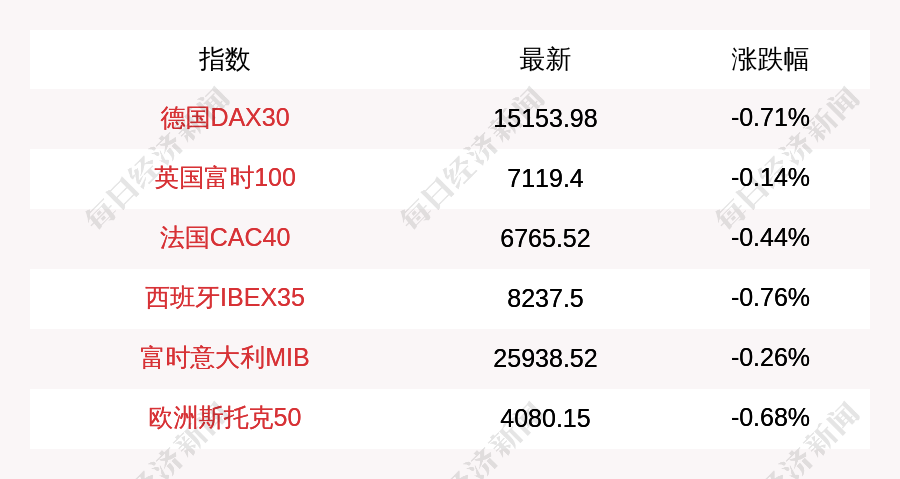 每经AI快讯:北京时间12月4日00:30,德国DAX30指数收盘下跌109.13点,跌幅为0.71%,报收15153.98点;英国富时100指数收盘下跌9.81点,跌幅为0.14%,报收7119.4点;法国CAC40指数收盘下跌30.23点,跌幅为0.44%,报收6765.52点;西班牙IBEX35指数收盘下跌63.3点,跌幅为0.76%,报收8237.5点;富时意大利MIB指数收盘下跌66.88点,跌幅为0.26%,报收25938.52点;欧洲斯托克50指数收盘下跌27.87点,跌幅为0.68%,报收4080.15点。