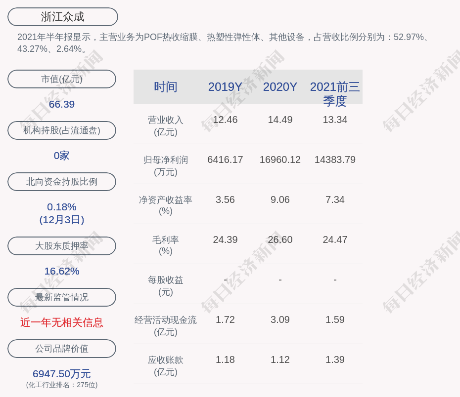 2021年半年报显示,浙江众成的主营业务为POF热收缩膜、热塑性弹性体、其他设备,占营收比例分别为:52.97%、43.27%、2.64%。