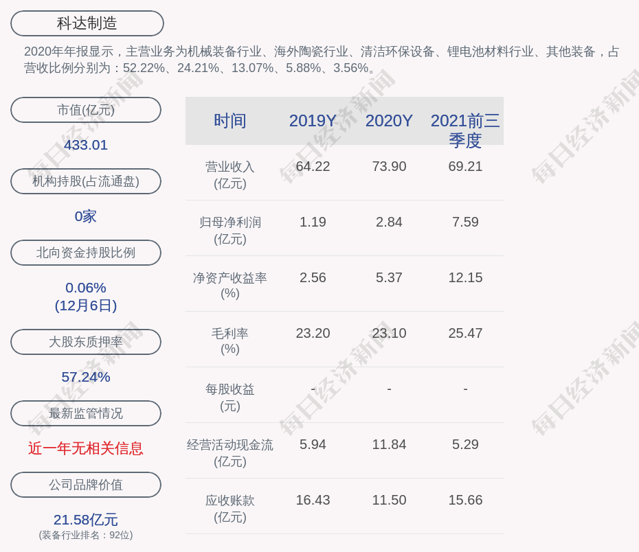 2020年年报显示,科达制造的主营业务为机械装备行业、海外陶瓷行业、清洁环保设备、锂电池材料行业、其他装备,占营收比例分别为:52.22%、24.21%、13.07%、5.88%、3.56%。