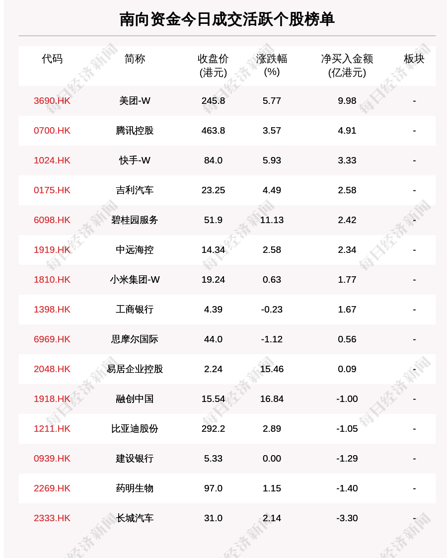南向资金成交活跃个股榜单中,净买入个股共10只,金额最多的是美团-W(3690.HK,收盘价:245.8港元),净买入9.983亿港元;净卖出个股共5只,金额最多的是长城汽车(2333.HK,收盘价:31.0港元),净卖出3.296亿港元。