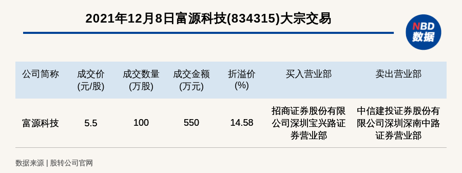 每经讯,2021年12月8日,新三板基础层公司富源科技(834315)发生一笔大宗交易,成交价5.5元/股,成交数量100万股,成交金额550万元,溢价14.58%。买入营业部是招商证券股份有限公司深圳宝兴路证券营业部,卖出营业部是中信建投证券股份有限公司深圳深南中路证券营业部。